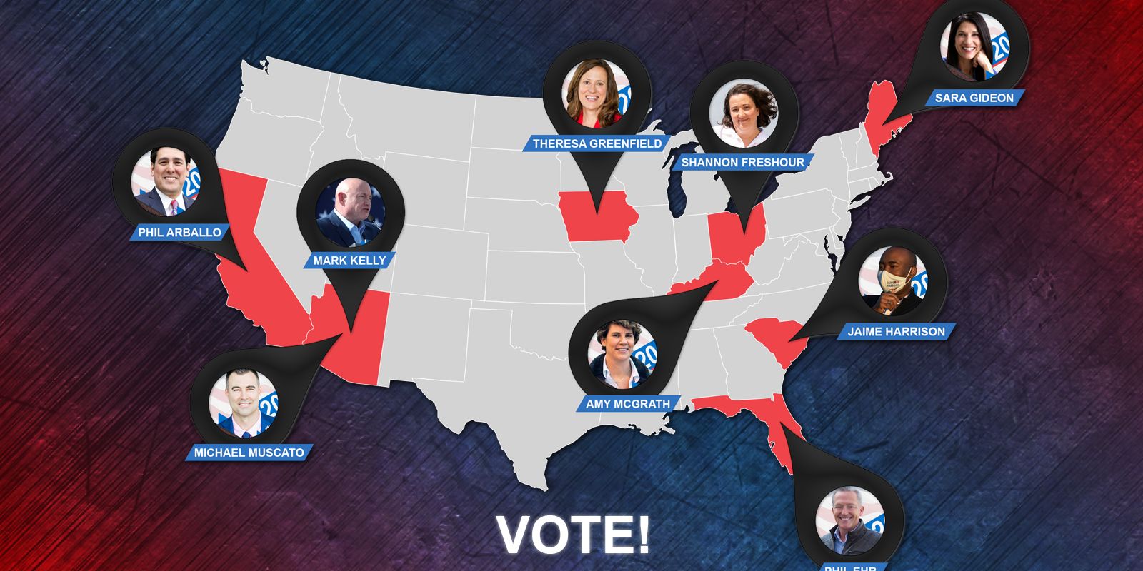 Our 2020 Candidates Written on 18 September 2020. VOTE! U.S. SENATE & CONGRESS CANDIDATES Kentuck South Carolina Arizona California Maine Iowa Arizona 8th District Ohio Florida USA America Amy McGrath Kentucky Jaime Harrison South Carolina Mark Kelly Arizona Phil Arballo California Sara Gideon Maine Theresa Greenfield Iowa Michael Muscato Arizona Shannon Freshour Ohio Phil Ehr Florida DEFEAT PRESIDENT TRUMP and other idiots at the ballot box. Prev Next